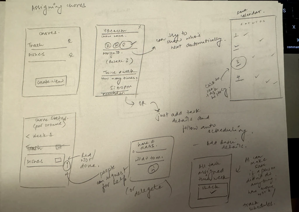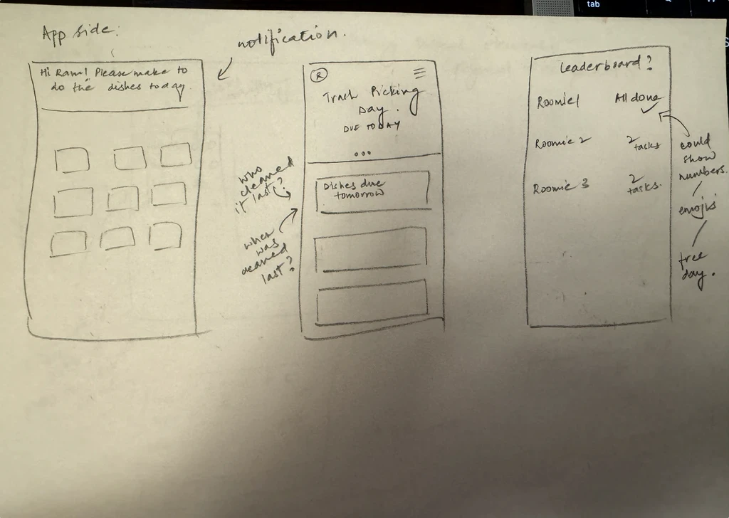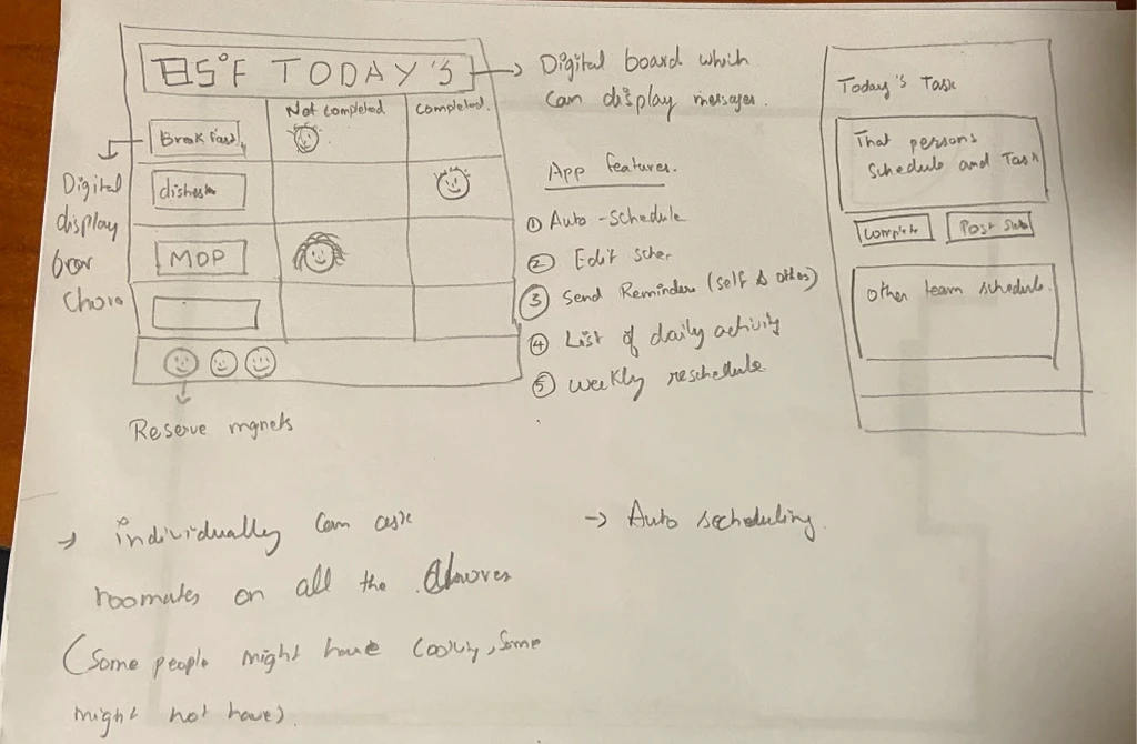 We started thinking of different mediums to achieve our design goals and make use of the physical spaces and digital platforms that roommates currently interact with.