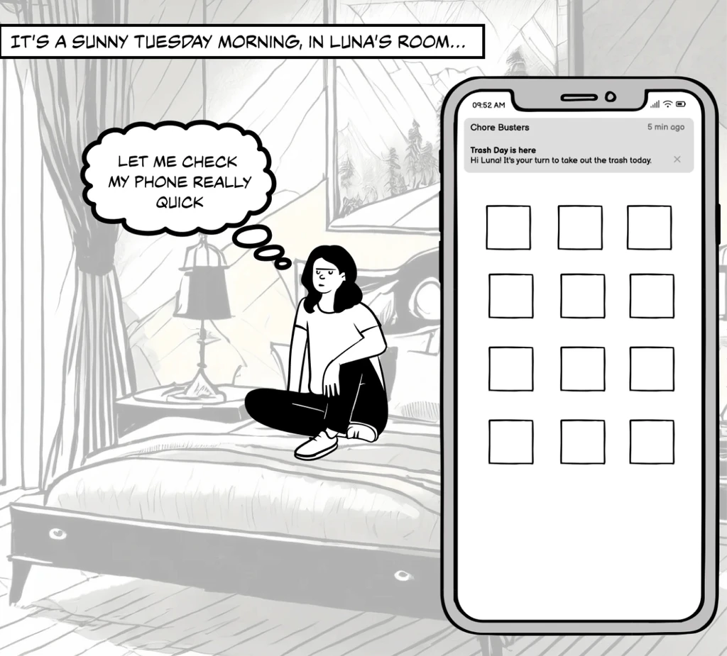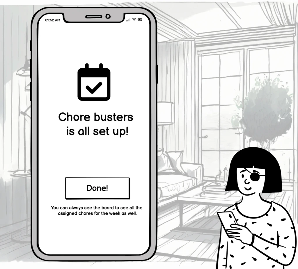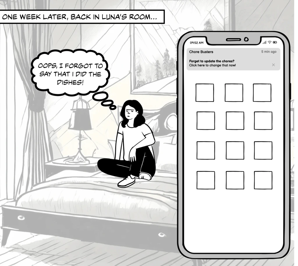 Here the storyboard speaks from a single roommate's perspective and takes us through their day-to-day experience with using the final Chore Busters solution, both the mobile app and the magnetic board.