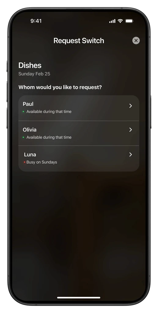 Roommates can easily request task switches amongst themselves in case of any personal conflicts.
